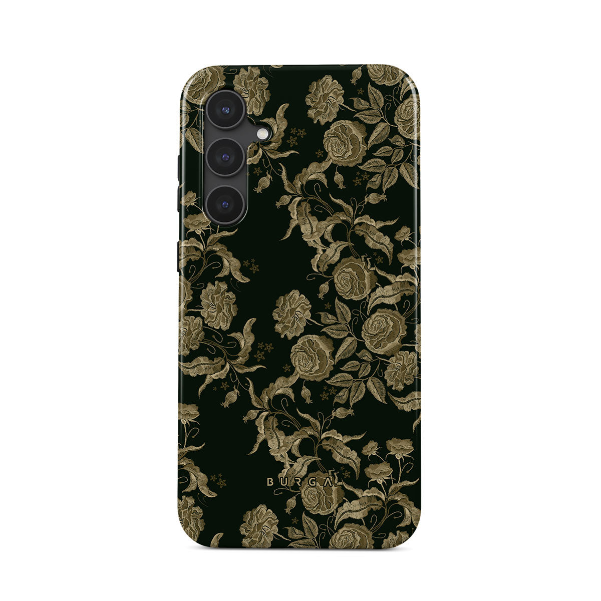 Questo design include: rose vintage, fogliame dorato, tonalità di verde intenso.