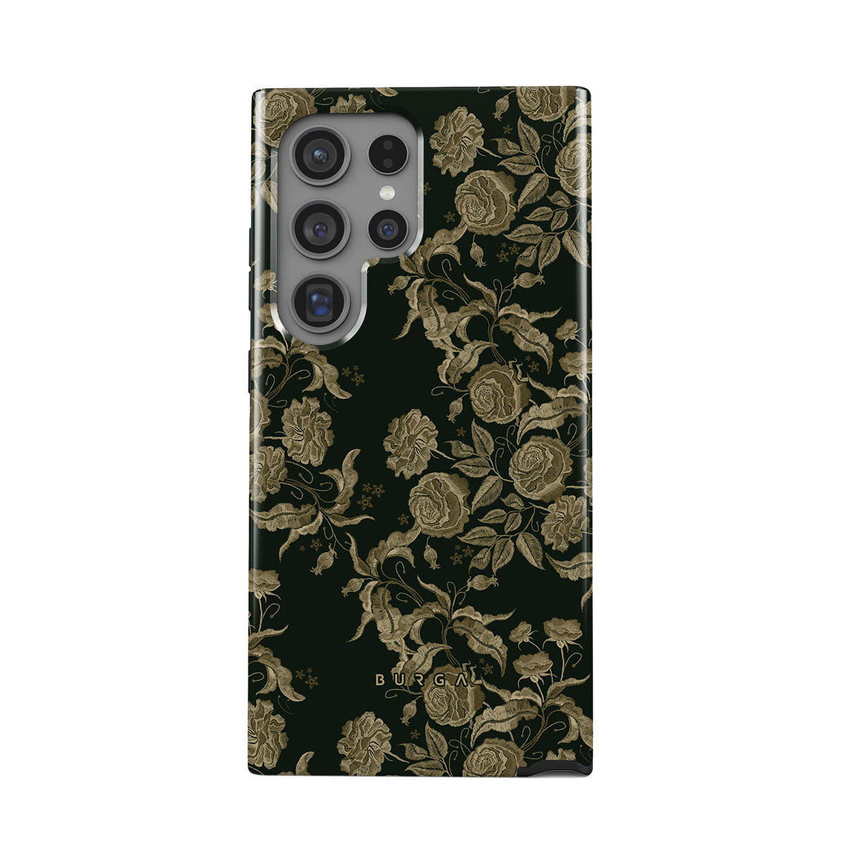 Questo design include: rose vintage, fogliame dorato, tonalità di verde intenso.