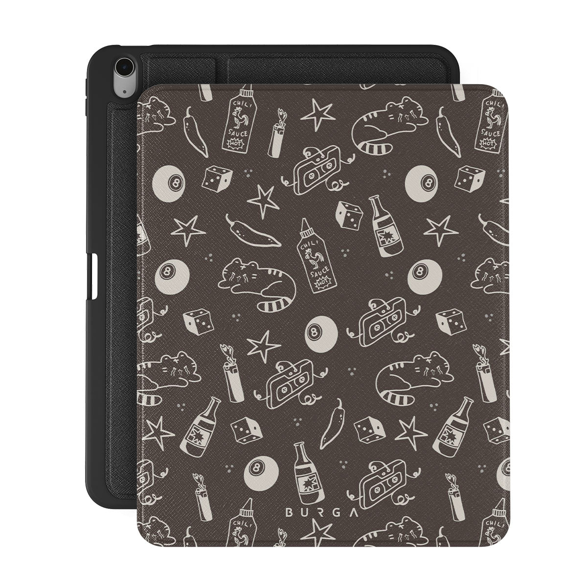 Questo design include: sfondo marrone, disegni divertenti, gatti, stelle, peperoncino, dado, palla da biliardo, musicassetta