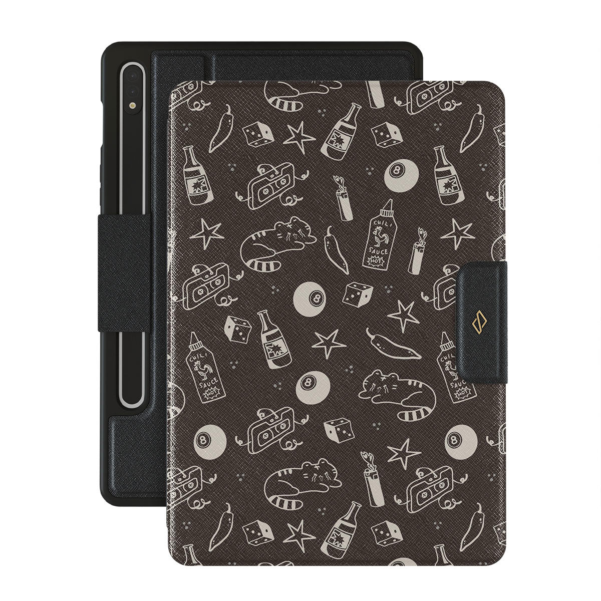 Questo design include: sfondo marrone, disegni divertenti, gatti, stelle, peperoncino, dado, palla da biliardo, musicassetta