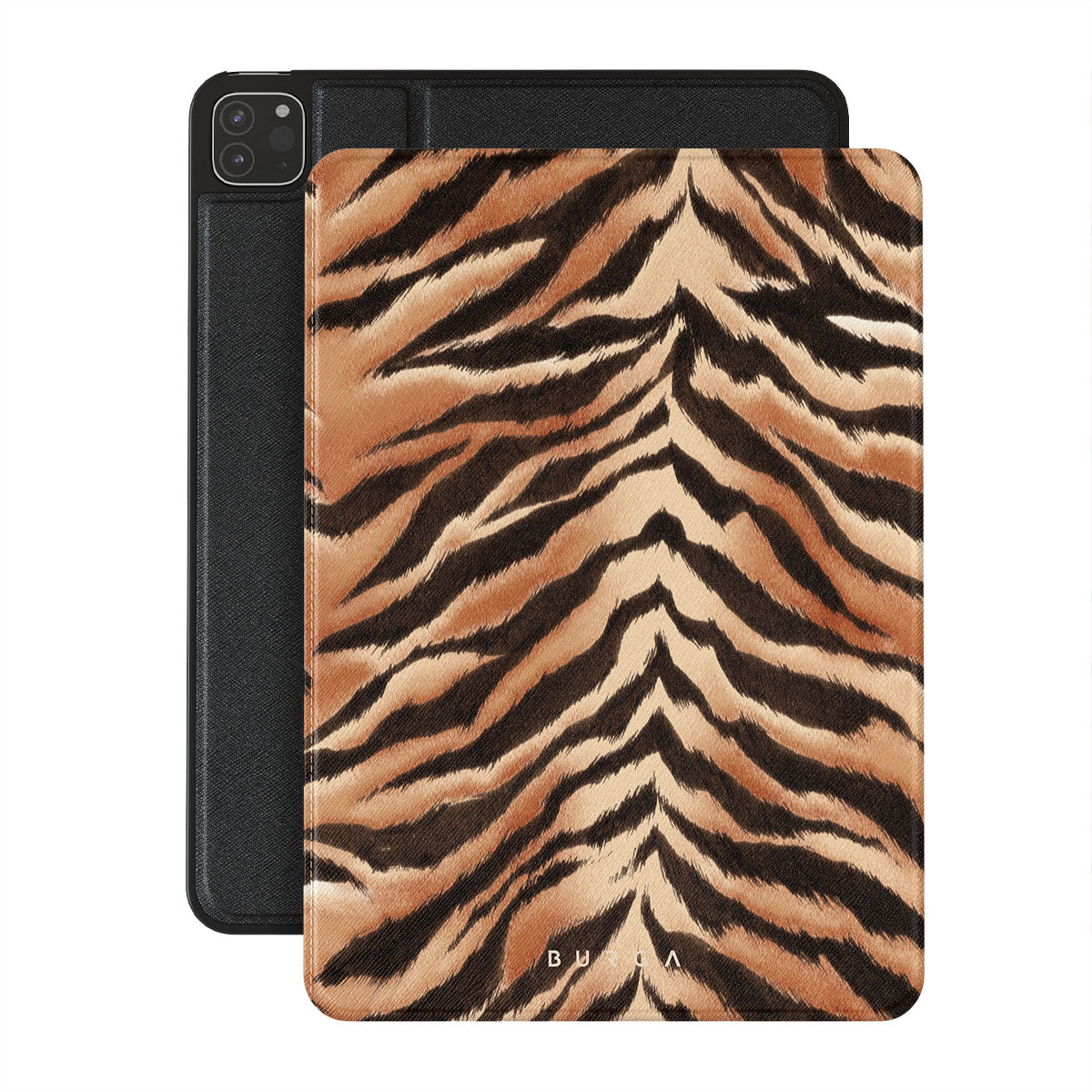 Questo design include: strisce di tigre, nero, arancione, stampa animale, motivo audace.