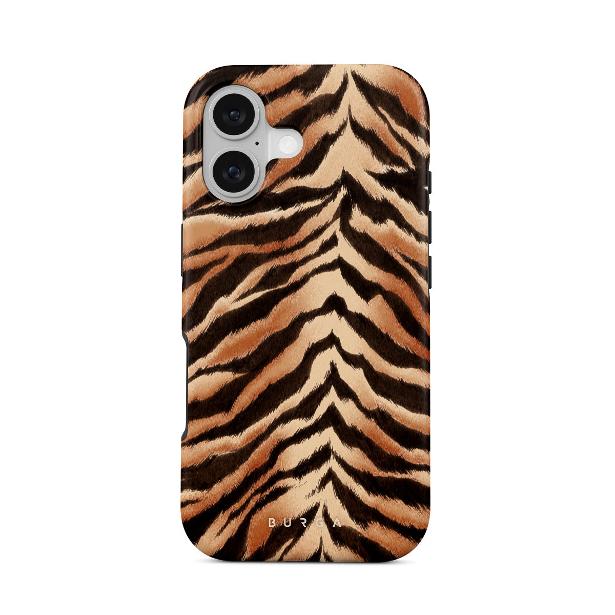 Questo design include: strisce di tigre, nero, arancione, stampa animale, motivo audace.