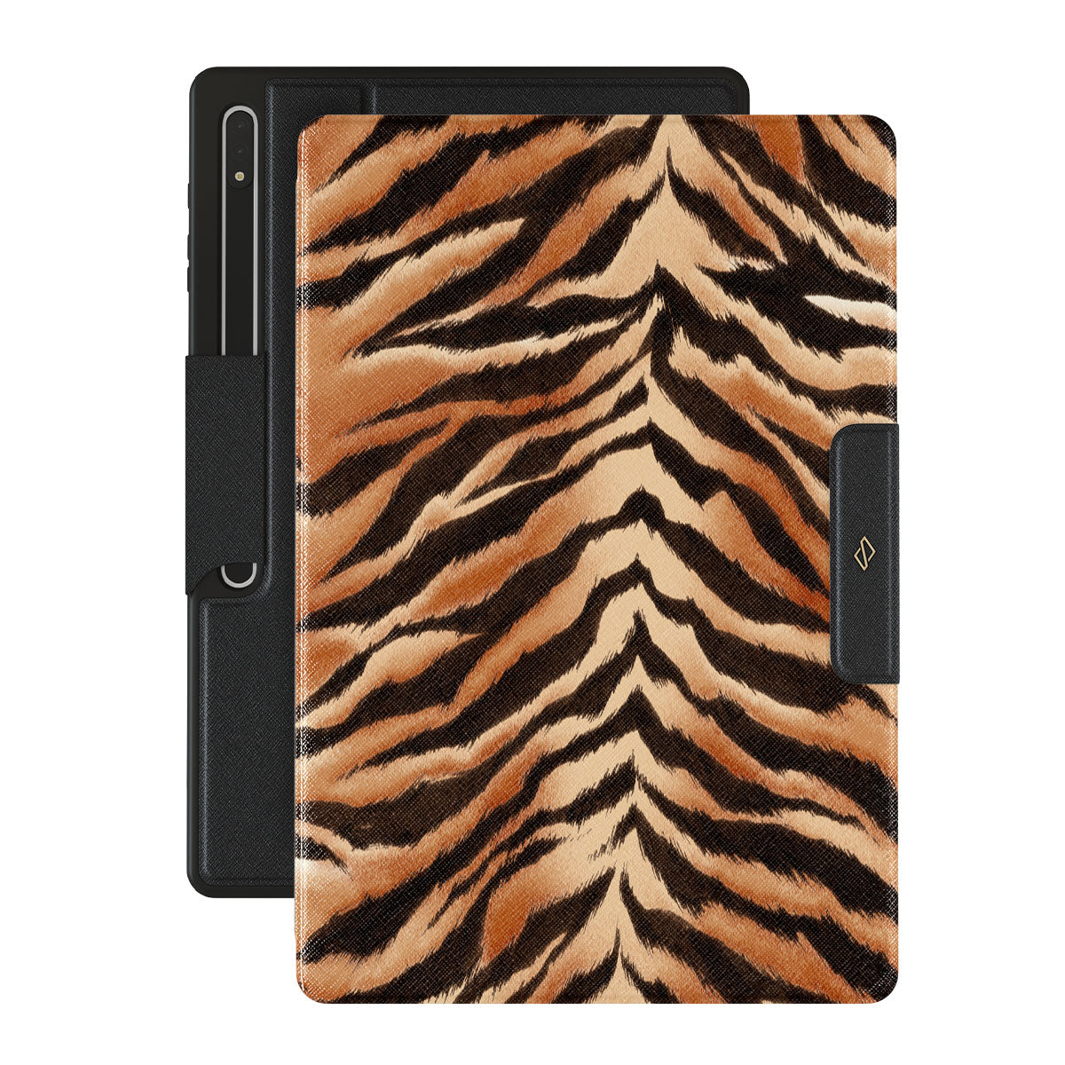 Questo design include: strisce di tigre, nero, arancione, stampa animale, motivo audace.