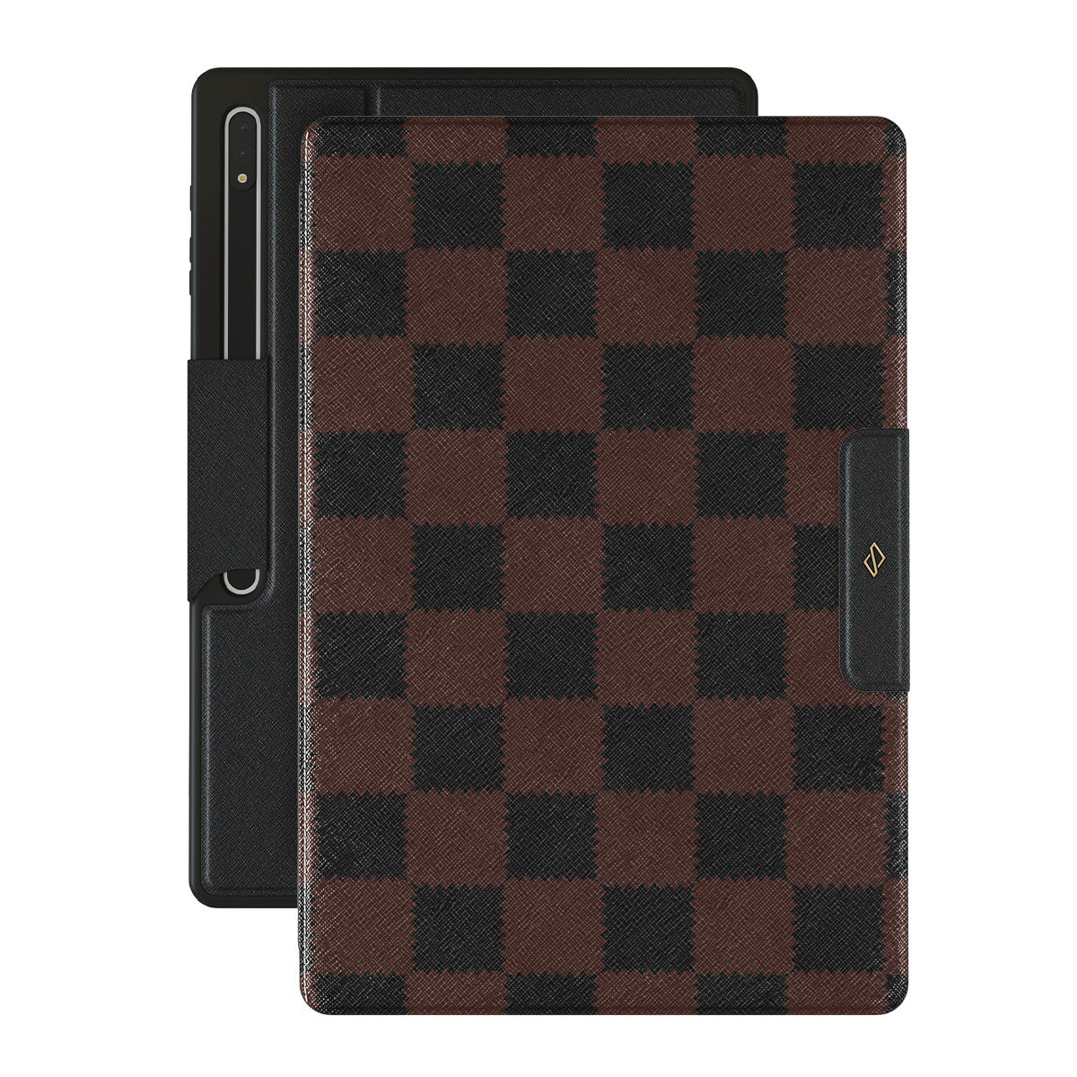 Questo design include: motivo a scacchi, colore marrone, colori scuri, forme geometriche