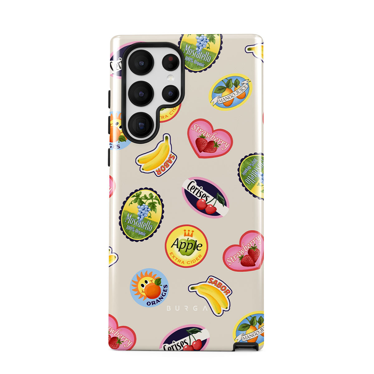 Questo design include: Banane, francobolli, ciliegie, mele, arance, fragole, colori vivaci, accenti di agrumi, motivi fruttati, motivi tropicali.