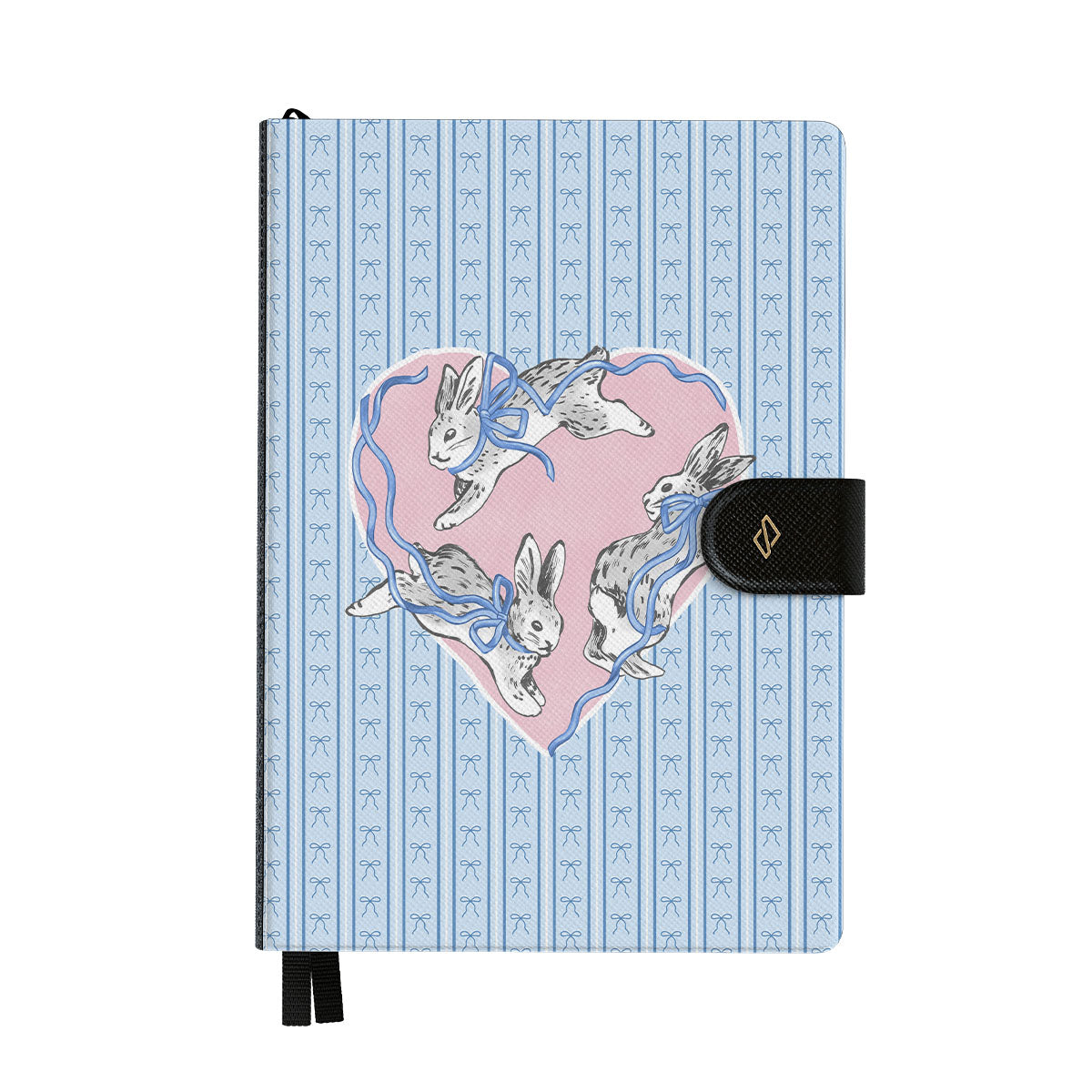 Questo design include: conigli bianchi, cornice a cuore, righe blu