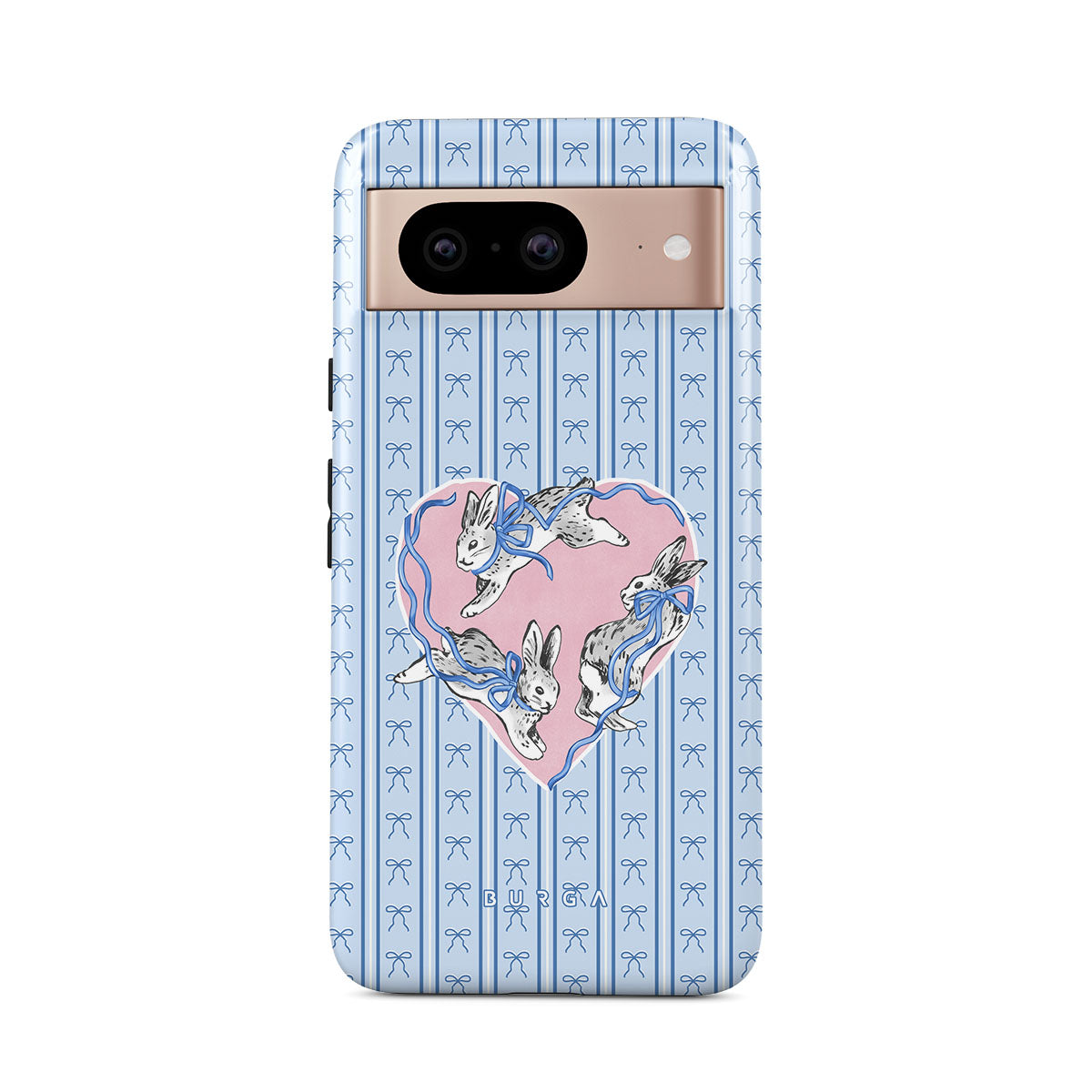 Questo design include: conigli bianchi, cornice a cuore, righe blu