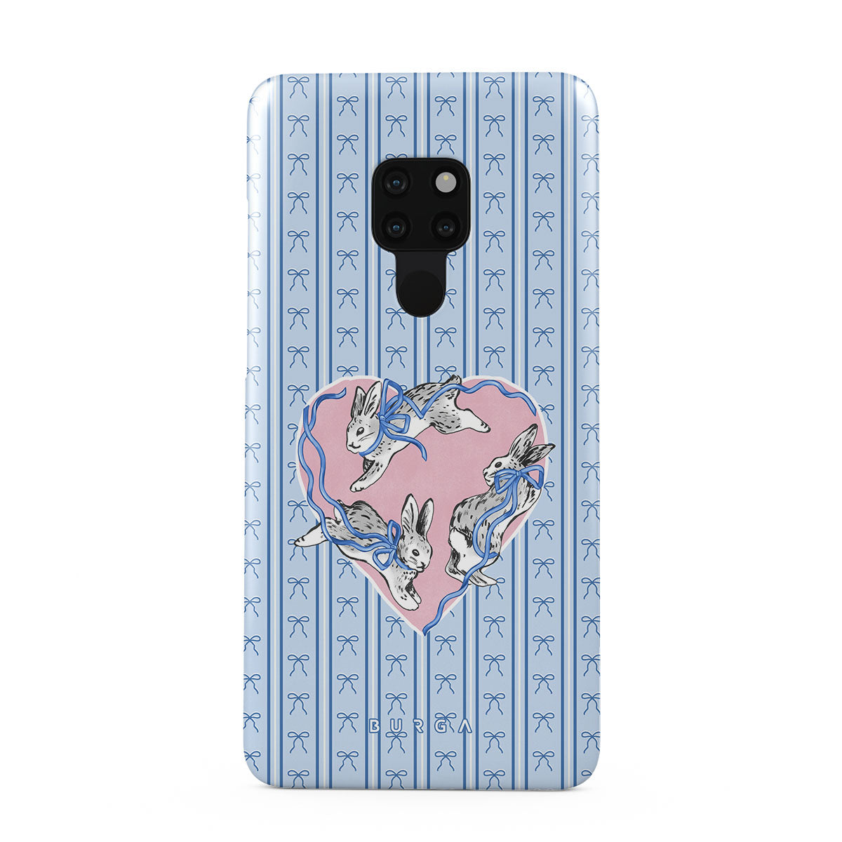 Questo design include: conigli bianchi, cornice a cuore, righe blu