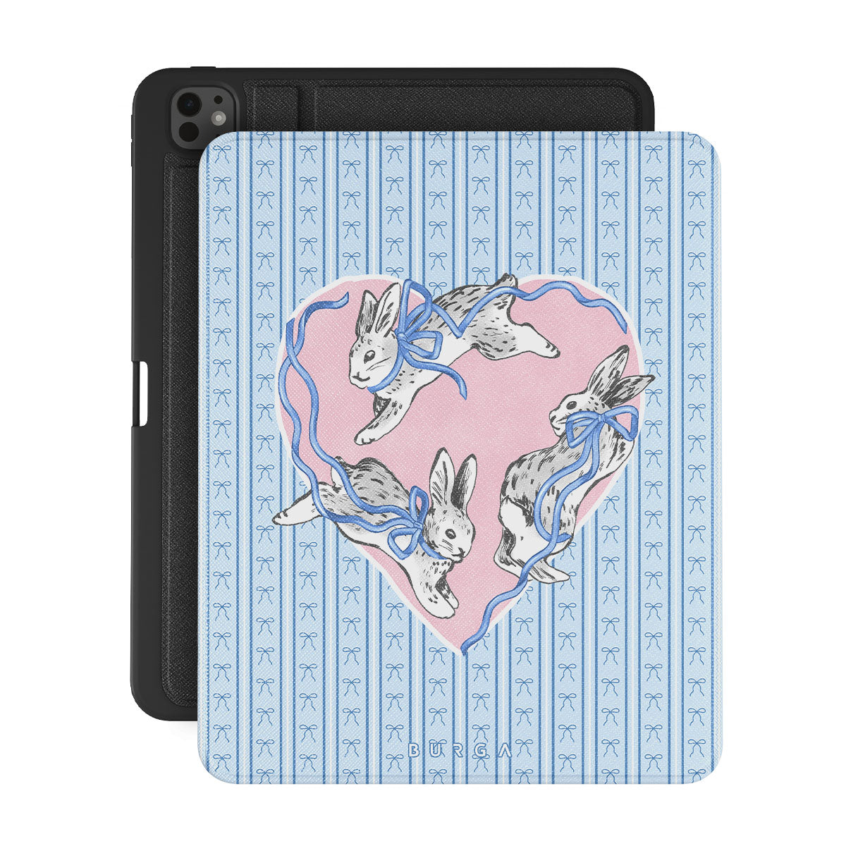 Questo design include: conigli bianchi, cornice a cuore, righe blu