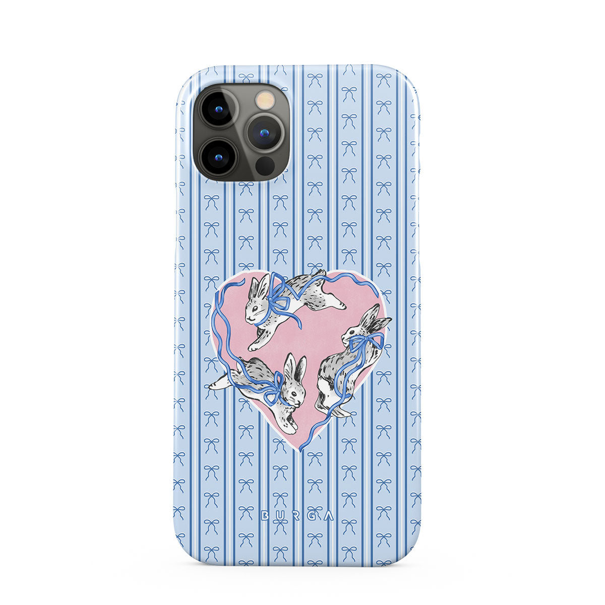 Questo design include: conigli bianchi, cornice a cuore, righe blu