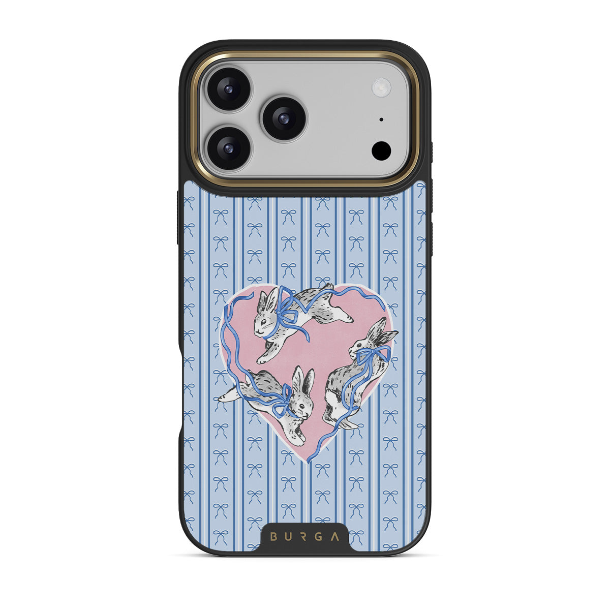 Questo design include: conigli bianchi, cornice a cuore, righe blu