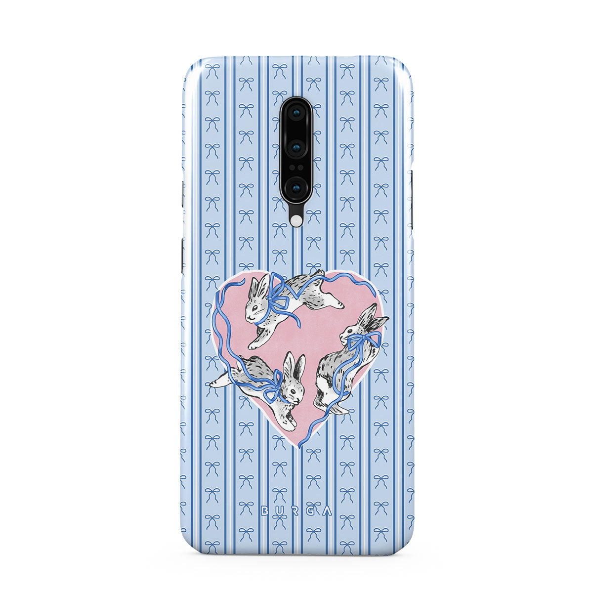 Questo design include: conigli bianchi, cornice a cuore, righe blu
