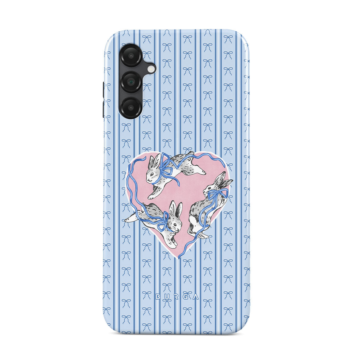 Questo design include: conigli bianchi, cornice a cuore, righe blu