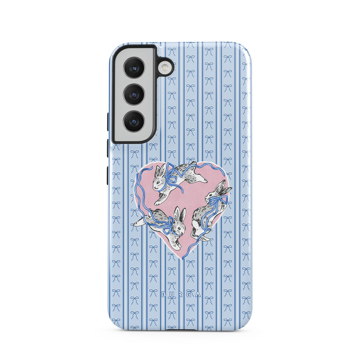 Questo design include: conigli bianchi, cornice a cuore, righe blu