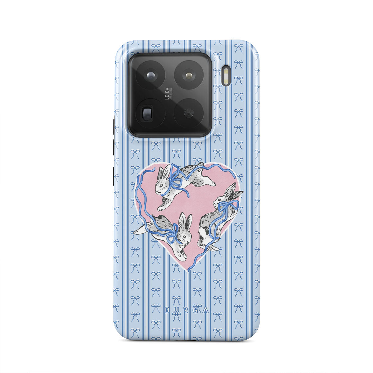 Questo design include: conigli bianchi, cornice a cuore, righe blu