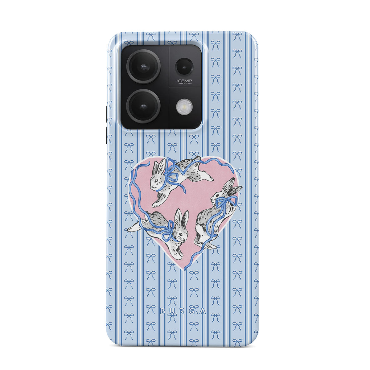 Questo design include: conigli bianchi, cornice a cuore, righe blu