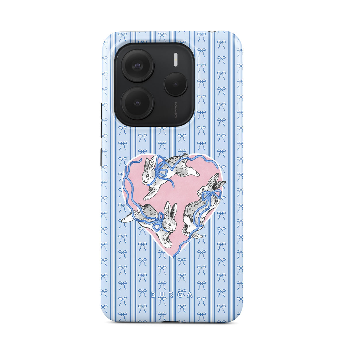 Questo design include: conigli bianchi, cornice a cuore, righe blu