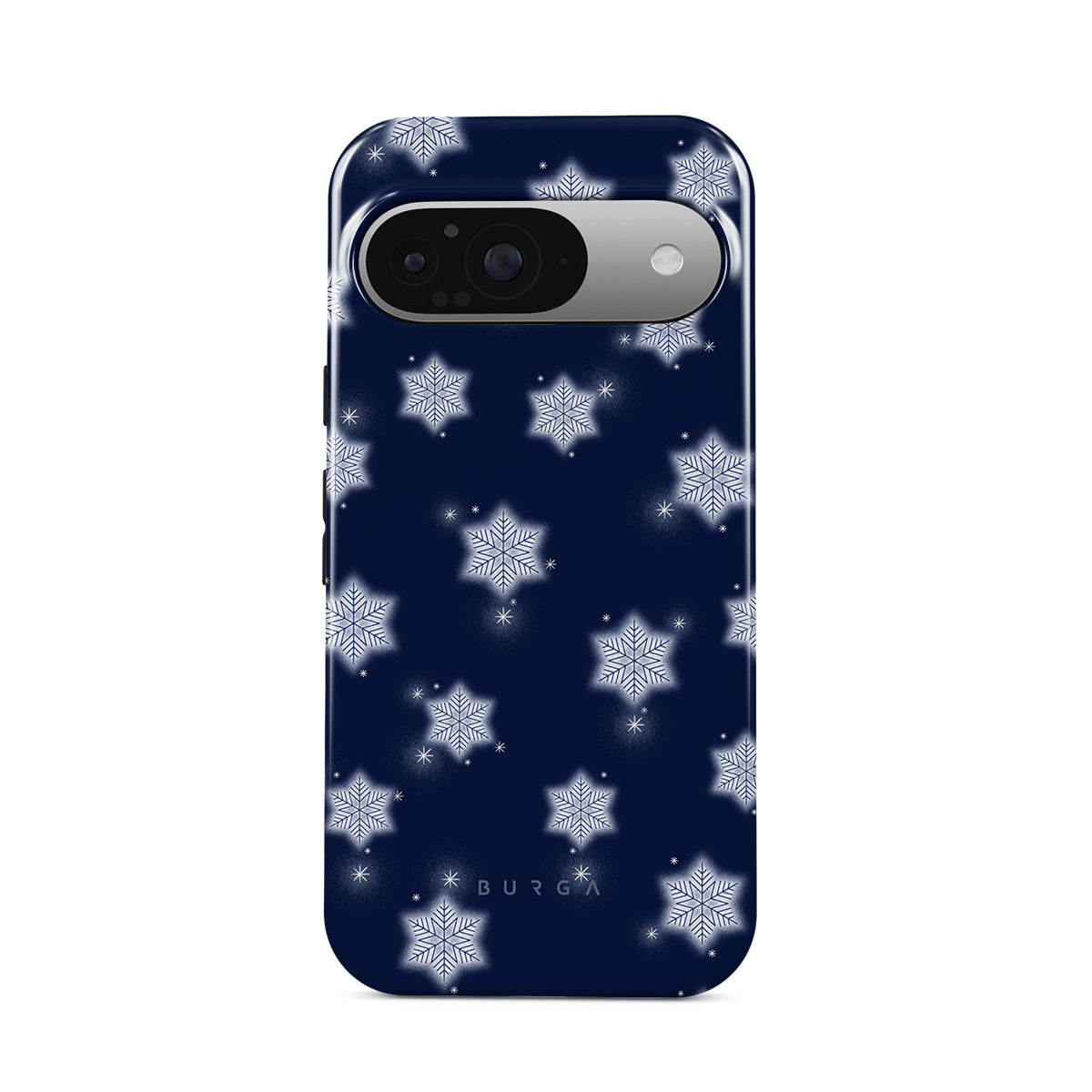 Questo design include: fiocchi di neve bianchi, sfondo blu navy, motivo fiocchi di neve invernali, fiocchi di neve geometrici, design invernale classico