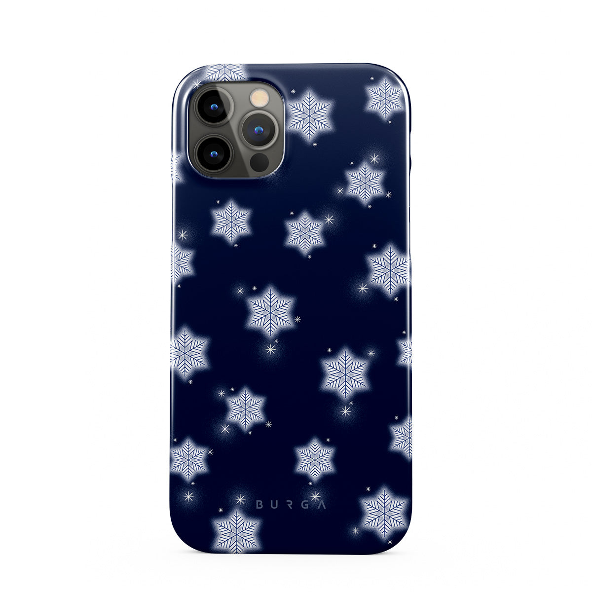Questo design include: fiocchi di neve bianchi, sfondo blu navy, motivo fiocchi di neve invernali, fiocchi di neve geometrici, design invernale classico