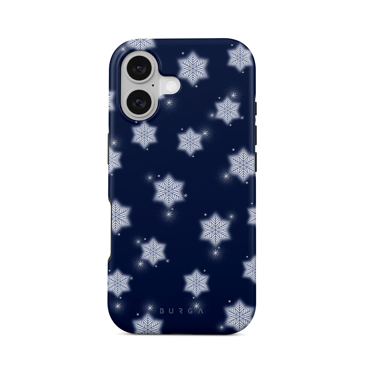 Questo design include: fiocchi di neve bianchi, sfondo blu navy, motivo fiocchi di neve invernali, fiocchi di neve geometrici, design invernale classico