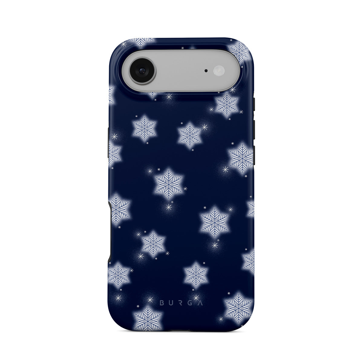 Questo design include: fiocchi di neve bianchi, sfondo blu navy, motivo fiocchi di neve invernali, fiocchi di neve geometrici, design invernale classico