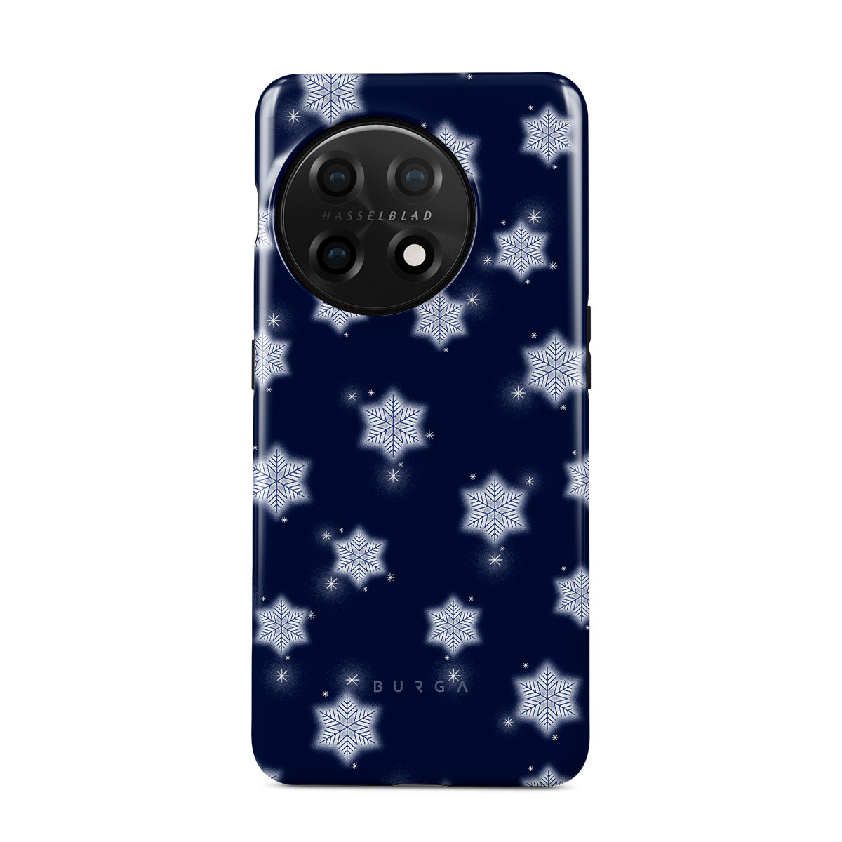 Questo design include: fiocchi di neve bianchi, sfondo blu navy, motivo fiocchi di neve invernali, fiocchi di neve geometrici, design invernale classico