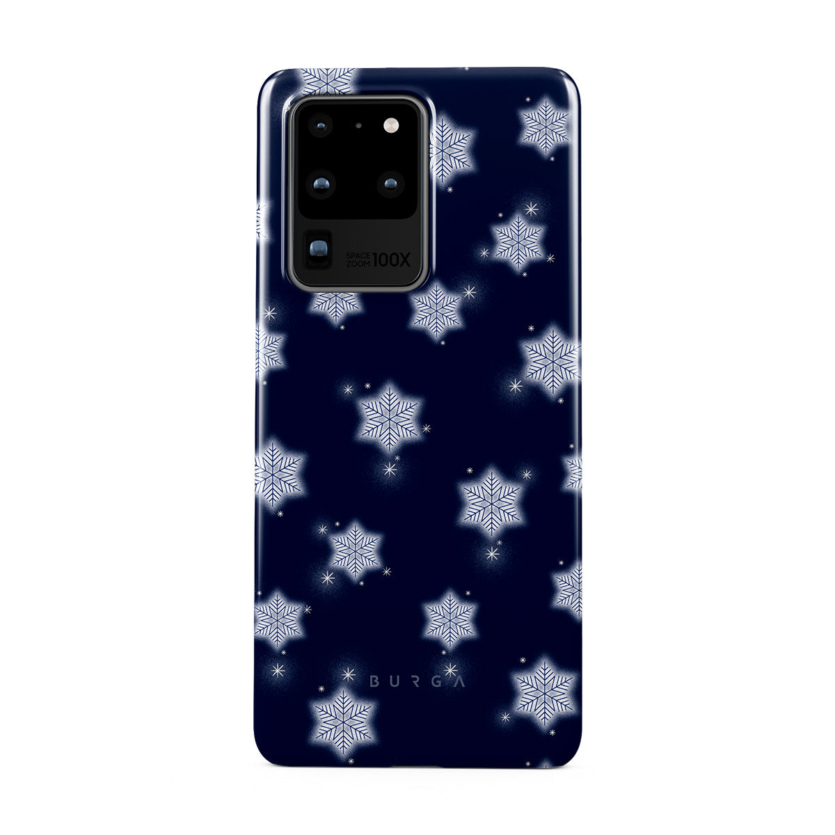 Questo design include: fiocchi di neve bianchi, sfondo blu navy, motivo fiocchi di neve invernali, fiocchi di neve geometrici, design invernale classico