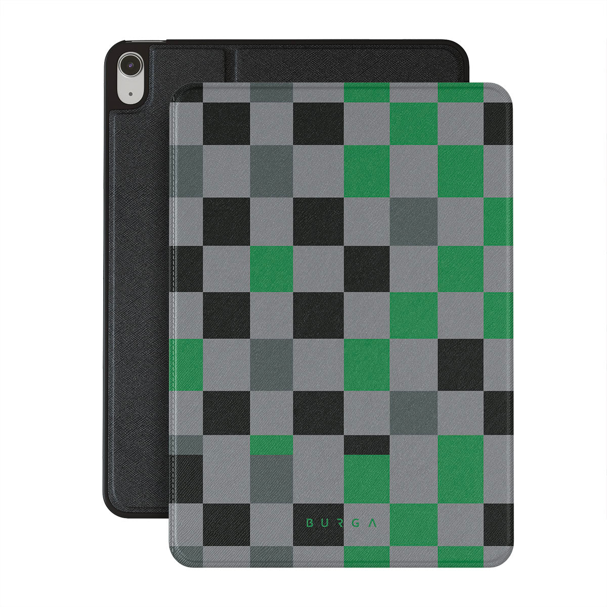Questo design include: motivo a scacchi, colore verde, colore grigio, colore nero, forme geometriche