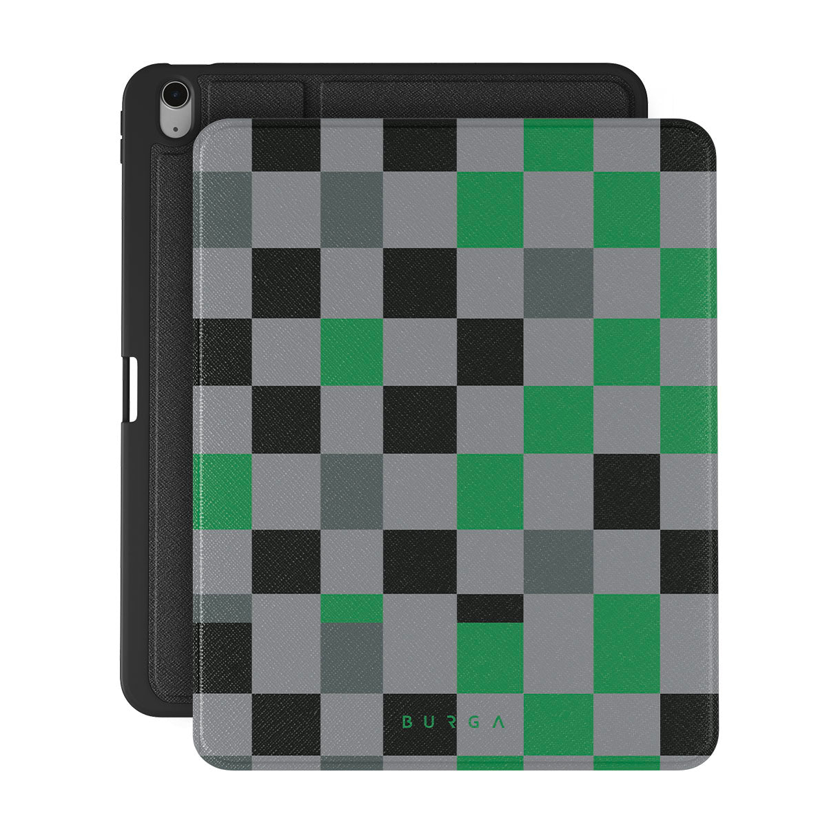 Questo design include: motivo a scacchi, colore verde, colore grigio, colore nero, forme geometriche