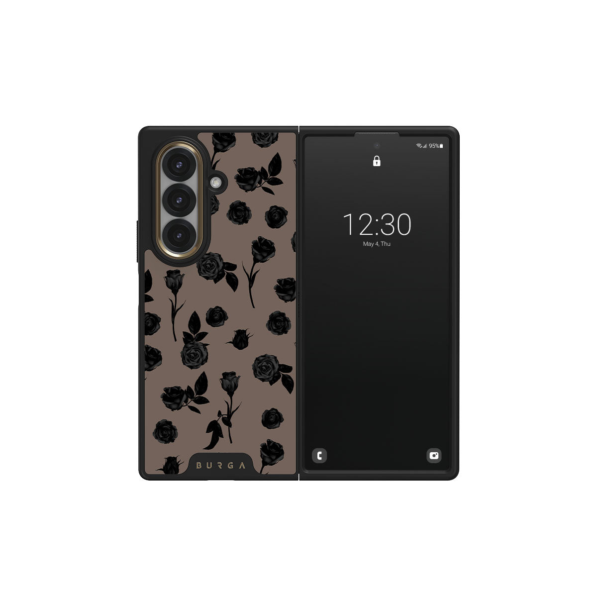 Questo design presenta: rose nere, tonalità della terra, dettagli floreali, fiori scuri.