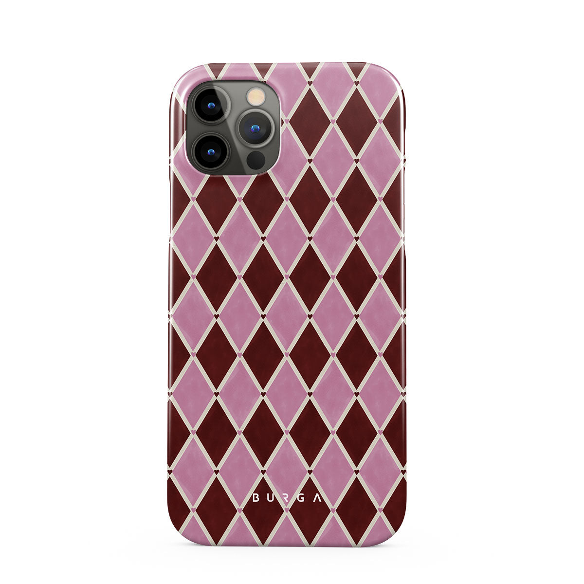 Questo design include: motivo arlecchino, rombi rosa, sfondo rosso intenso