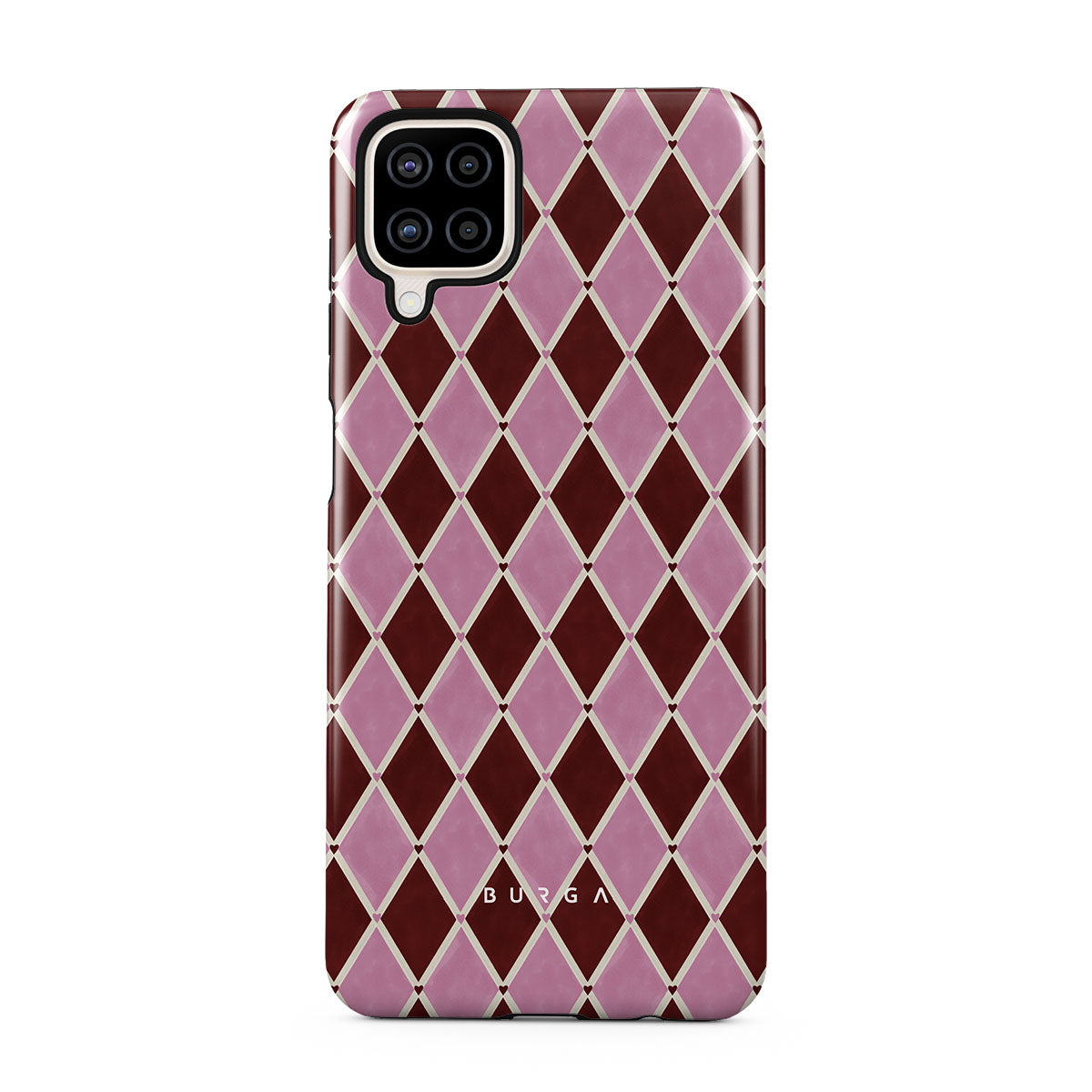 Questo design include: motivo arlecchino, rombi rosa, sfondo rosso intenso