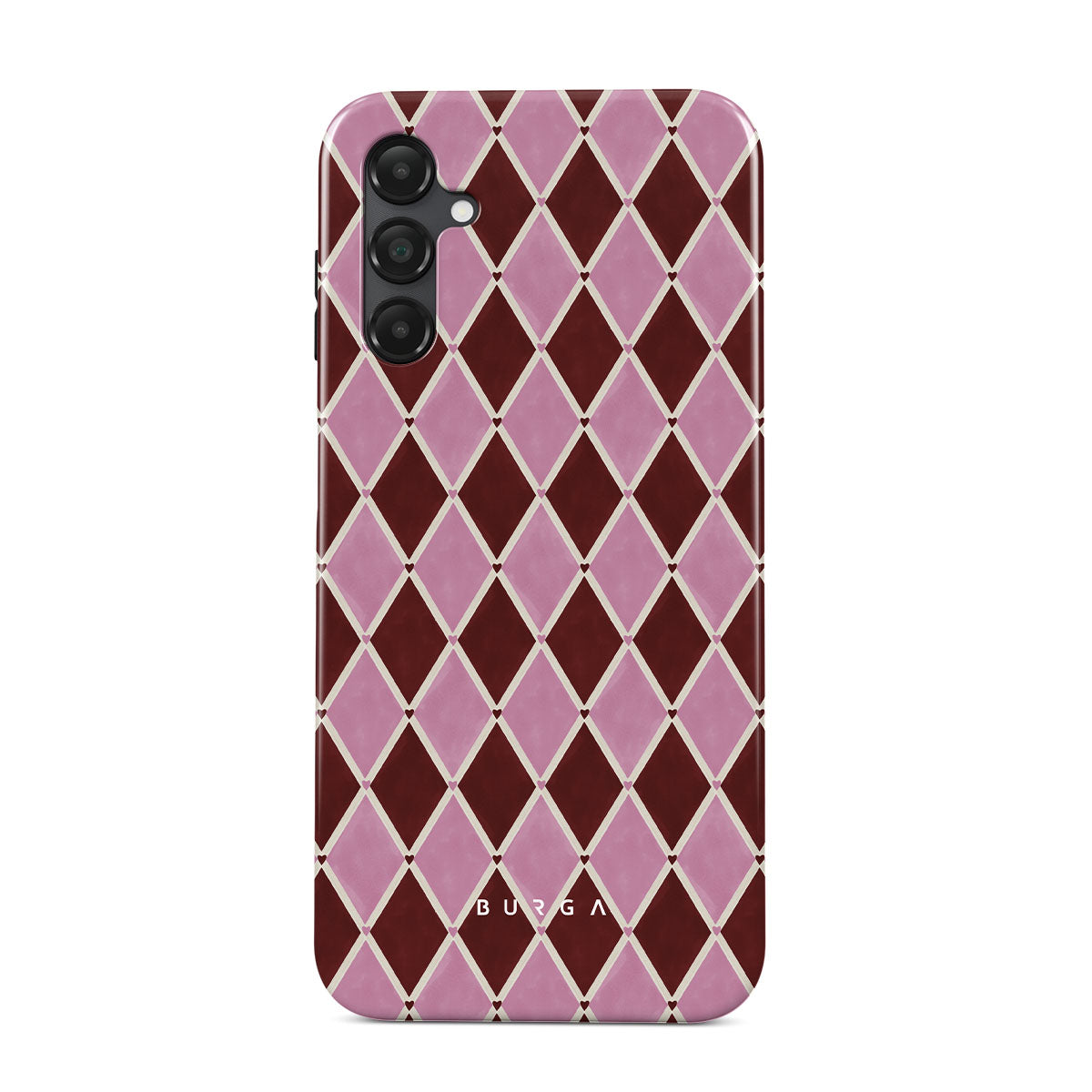 Questo design include: motivo arlecchino, rombi rosa, sfondo rosso intenso