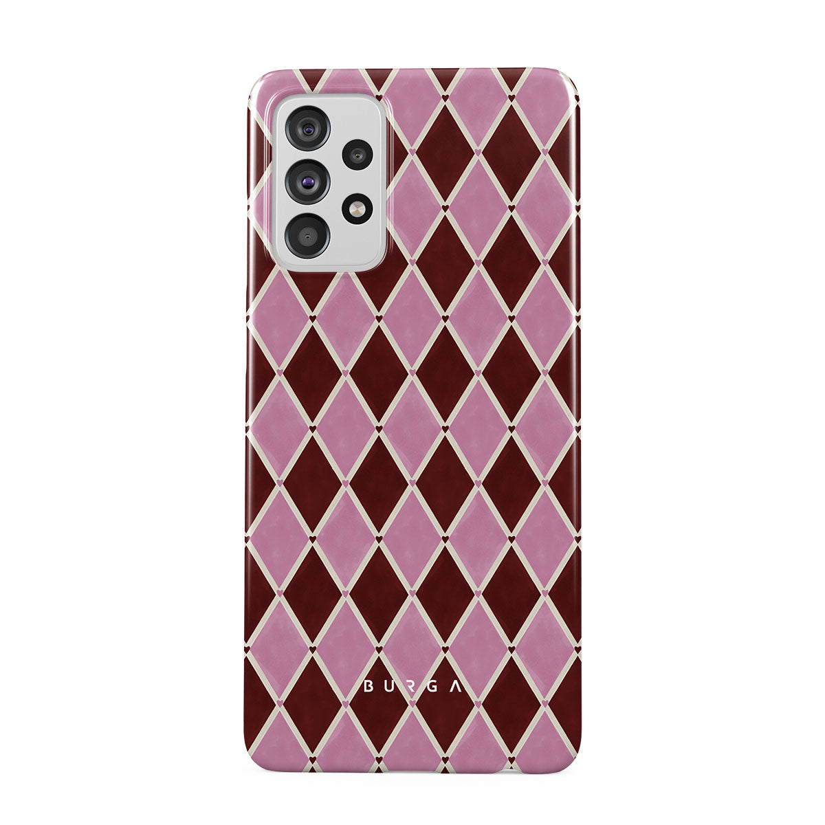 Questo design include: motivo arlecchino, rombi rosa, sfondo rosso intenso