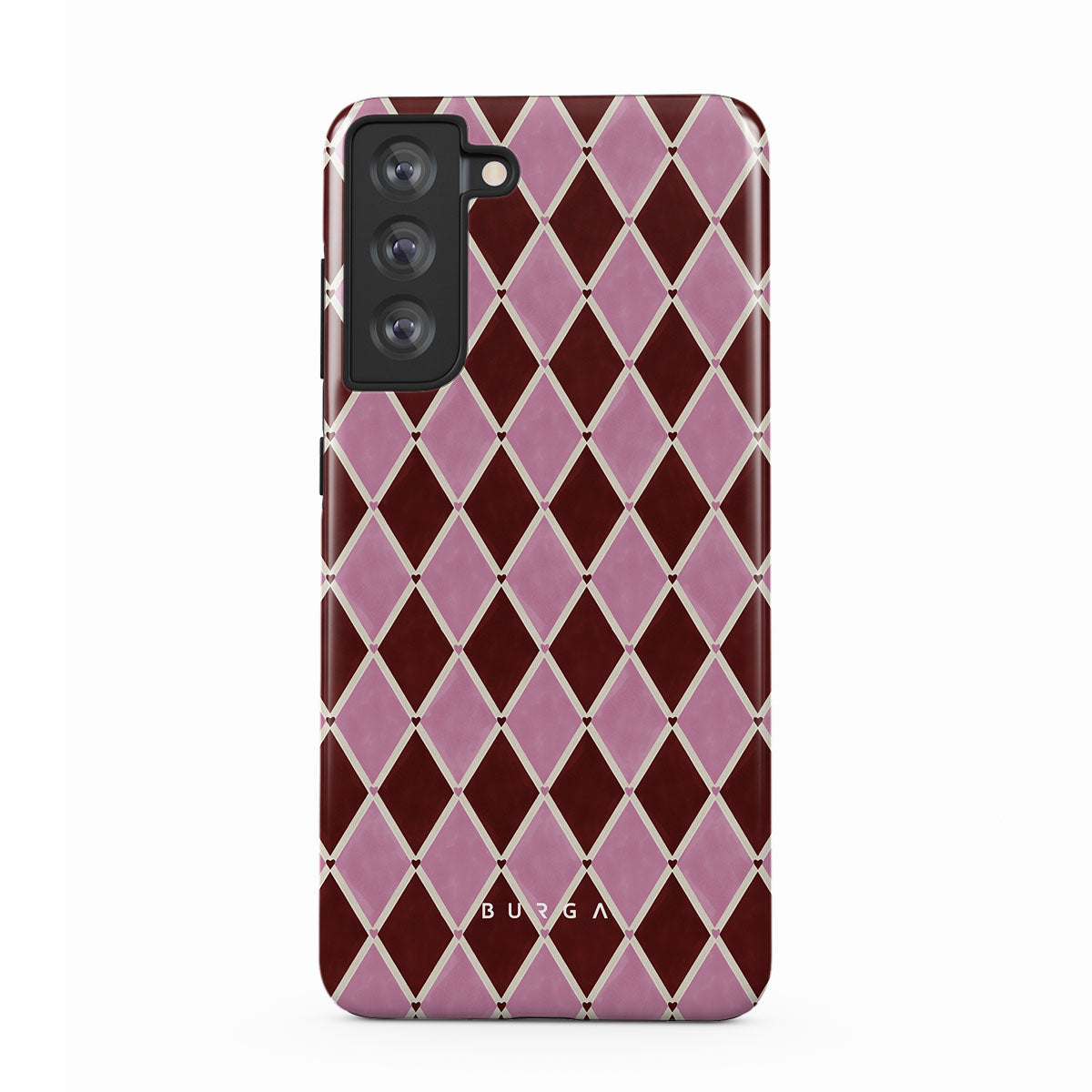 Questo design include: motivo arlecchino, rombi rosa, sfondo rosso intenso