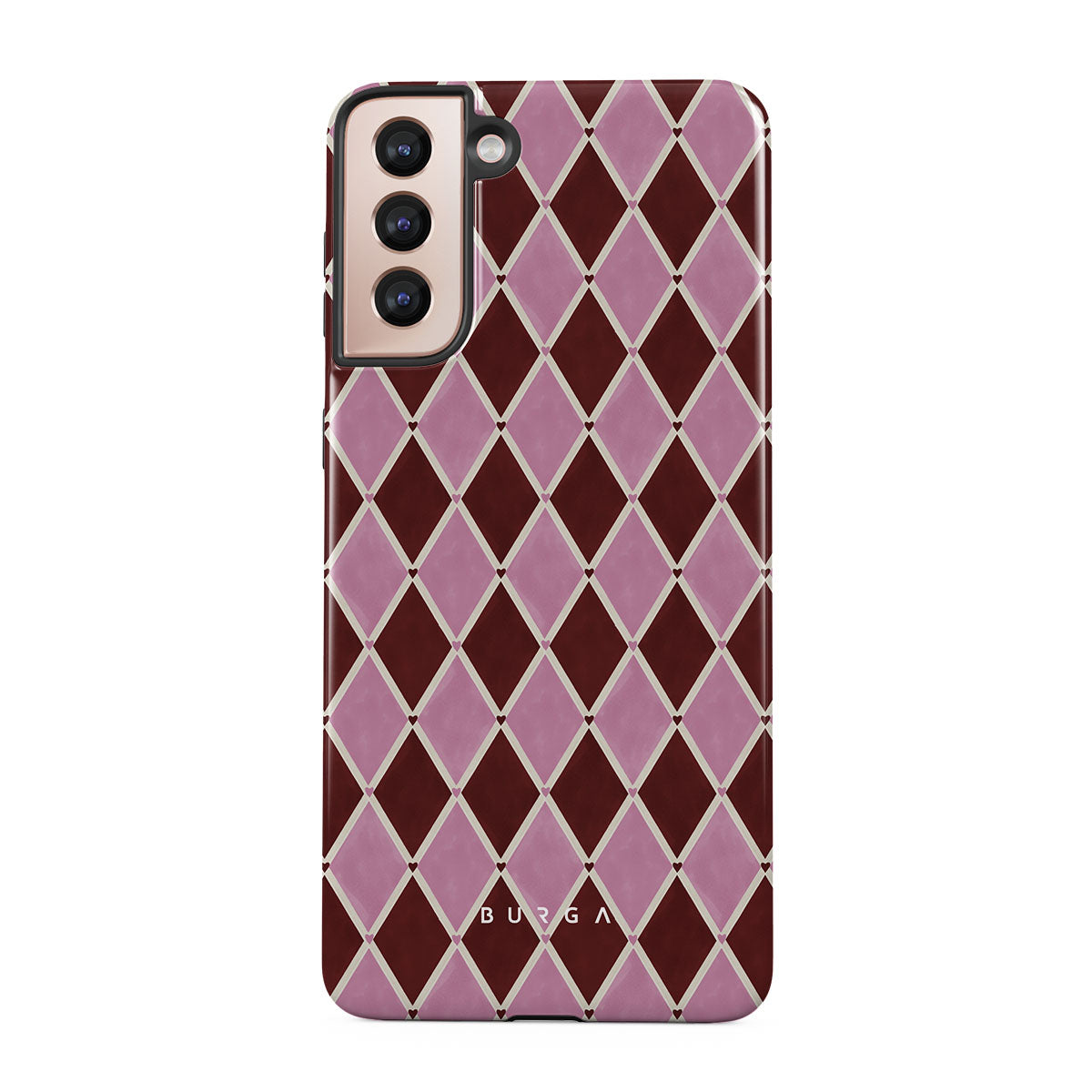 Questo design include: motivo arlecchino, rombi rosa, sfondo rosso intenso