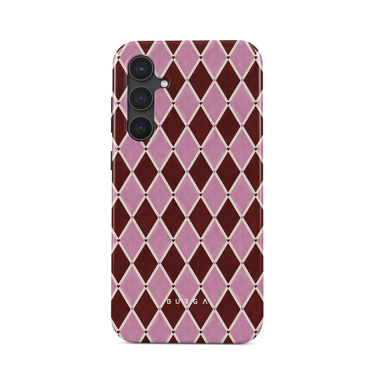 Questo design include: motivo arlecchino, rombi rosa, sfondo rosso intenso