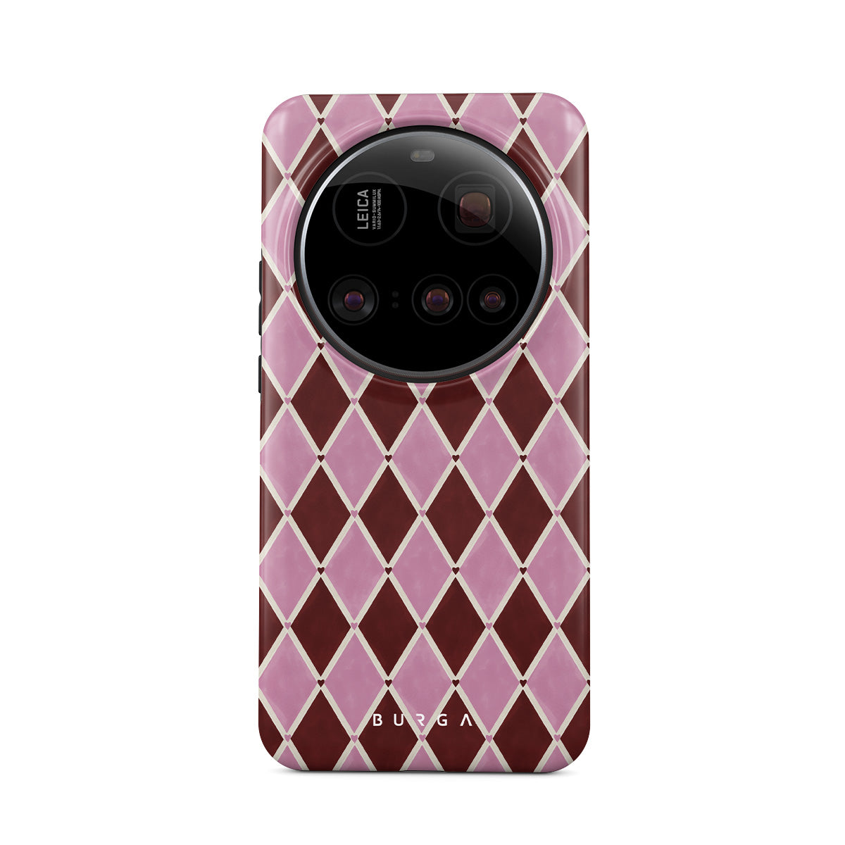 Questo design include: motivo arlecchino, rombi rosa, sfondo rosso intenso