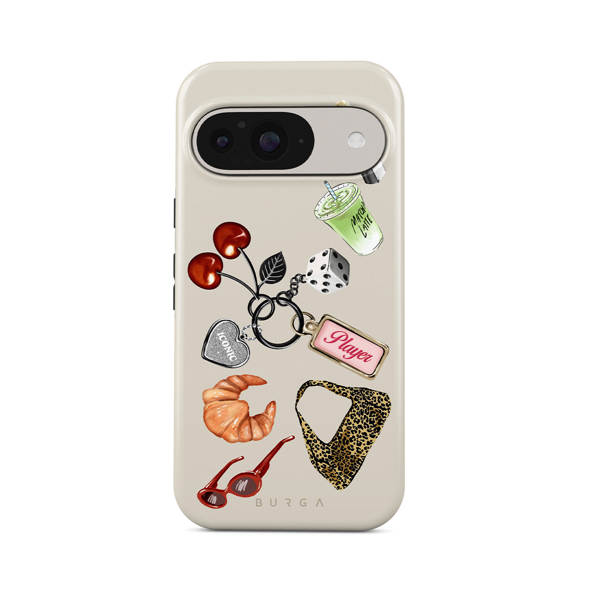 Questo design include: occhiali da sole rossi, rossetto rosso, matcha verde, croissant, dadi neri, borsa maculata leopardata, portachiavi con cuore d’argento, ciliegie, dadi e tag "Player".