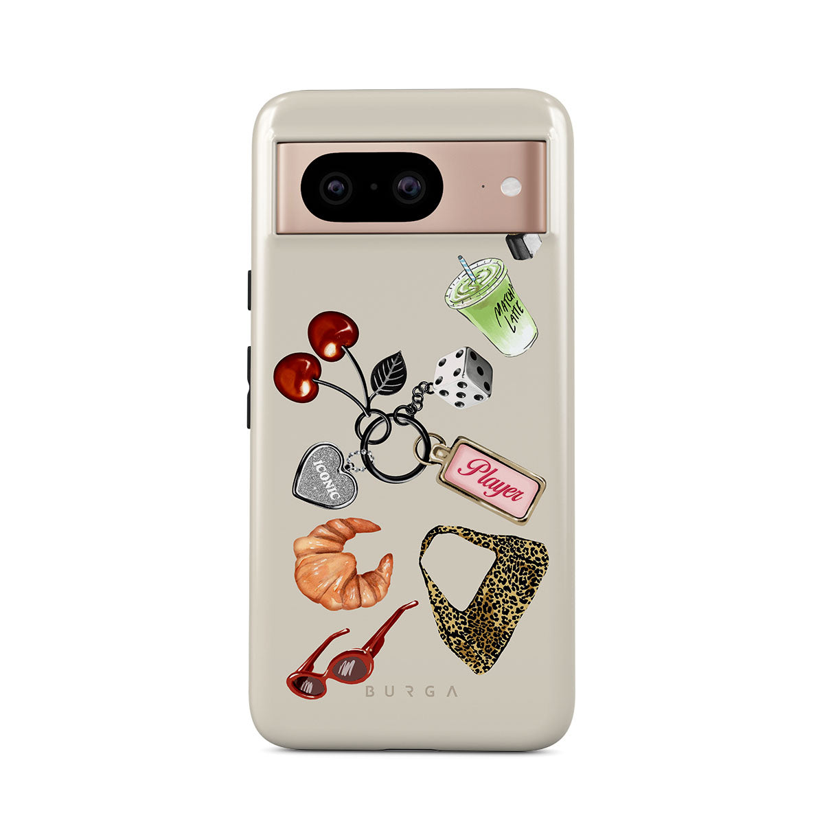 Questo design include: occhiali da sole rossi, rossetto rosso, matcha verde, croissant, dadi neri, borsa maculata leopardata, portachiavi con cuore d’argento, ciliegie, dadi e tag "Player".