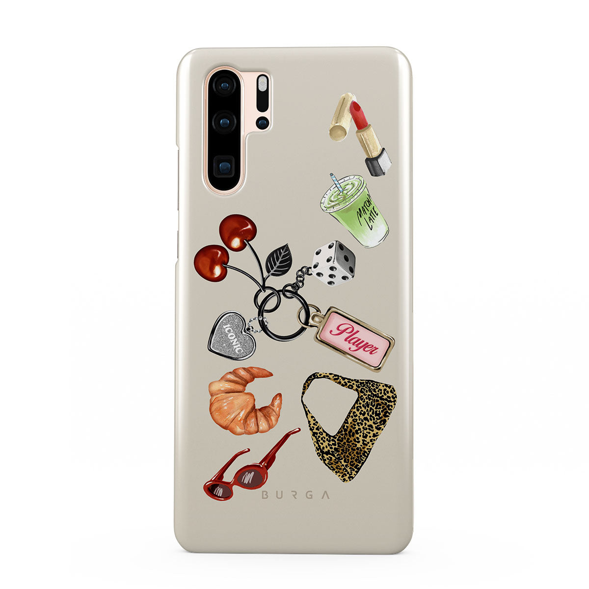 Questo design include: occhiali da sole rossi, rossetto rosso, matcha verde, croissant, dadi neri, borsa maculata leopardata, portachiavi con cuore d’argento, ciliegie, dadi e tag "Player".