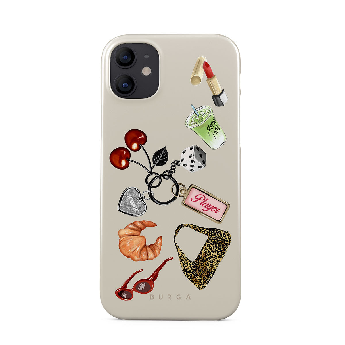 Questo design include: occhiali da sole rossi, rossetto rosso, matcha verde, croissant, dadi neri, borsa maculata leopardata, portachiavi con cuore d’argento, ciliegie, dadi e tag "Player".