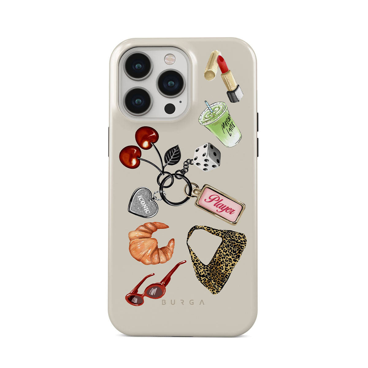 Questo design include: occhiali da sole rossi, rossetto rosso, matcha verde, croissant, dadi neri, borsa maculata leopardata, portachiavi con cuore d’argento, ciliegie, dadi e tag "Player".