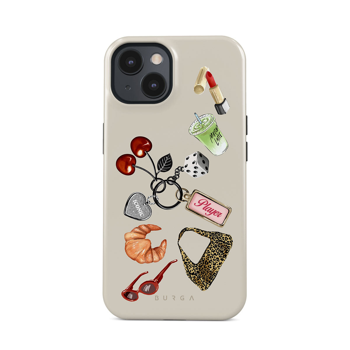 Questo design include: occhiali da sole rossi, rossetto rosso, matcha verde, croissant, dadi neri, borsa maculata leopardata, portachiavi con cuore d’argento, ciliegie, dadi e tag "Player".