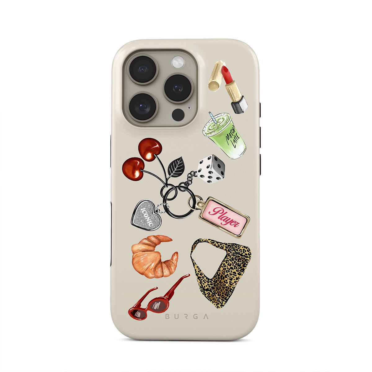 Questo design include: occhiali da sole rossi, rossetto rosso, matcha verde, croissant, dadi neri, borsa maculata leopardata, portachiavi con cuore d’argento, ciliegie, dadi e tag "Player".