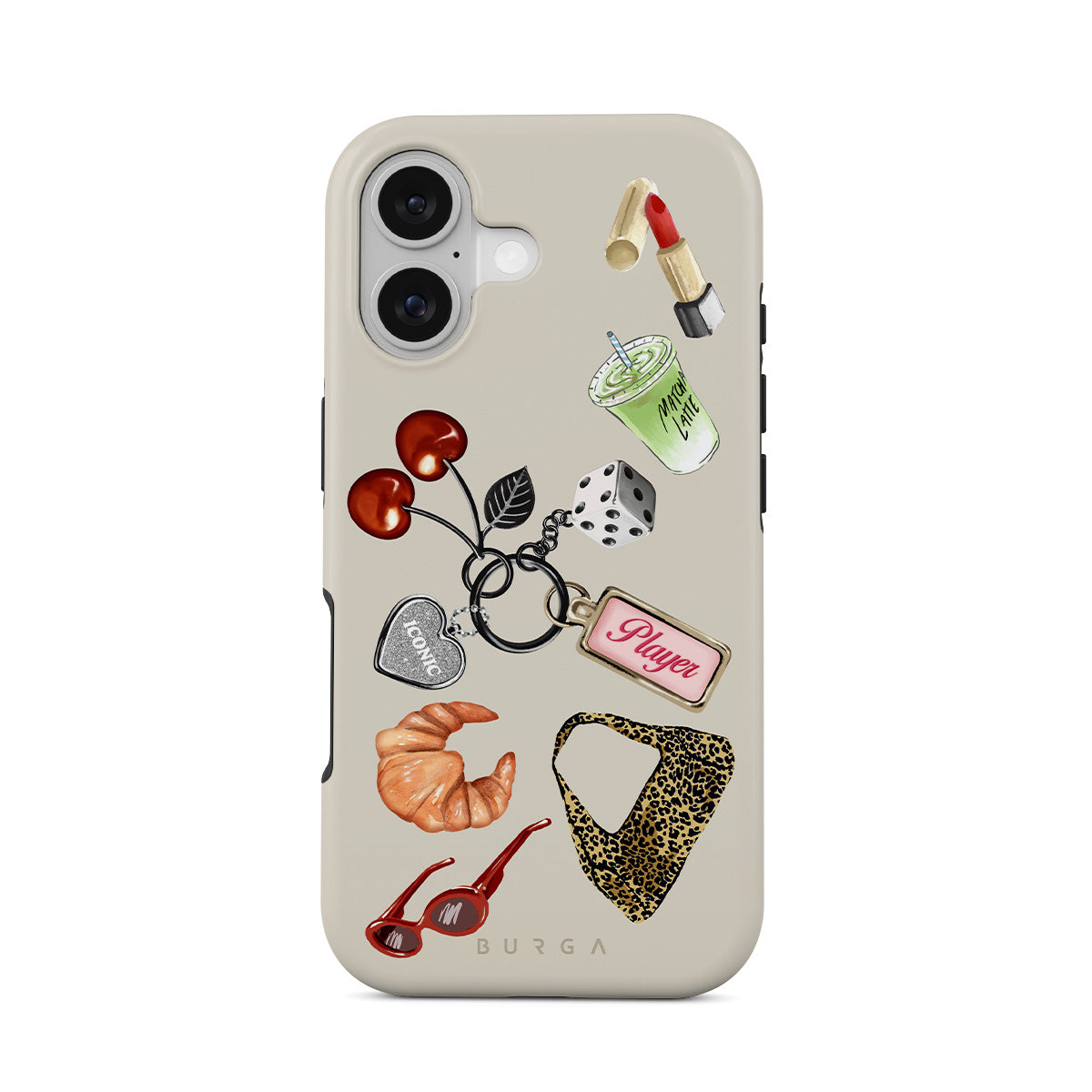 Questo design include: occhiali da sole rossi, rossetto rosso, matcha verde, croissant, dadi neri, borsa maculata leopardata, portachiavi con cuore d’argento, ciliegie, dadi e tag "Player".