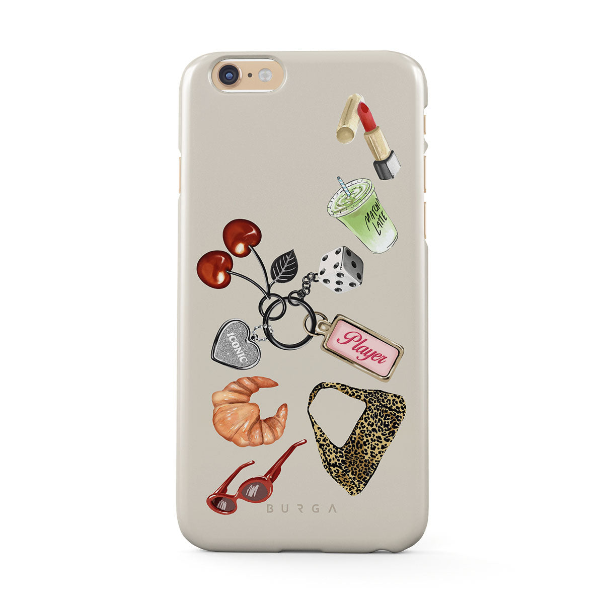 Questo design include: occhiali da sole rossi, rossetto rosso, matcha verde, croissant, dadi neri, borsa maculata leopardata, portachiavi con cuore d’argento, ciliegie, dadi e tag "Player".