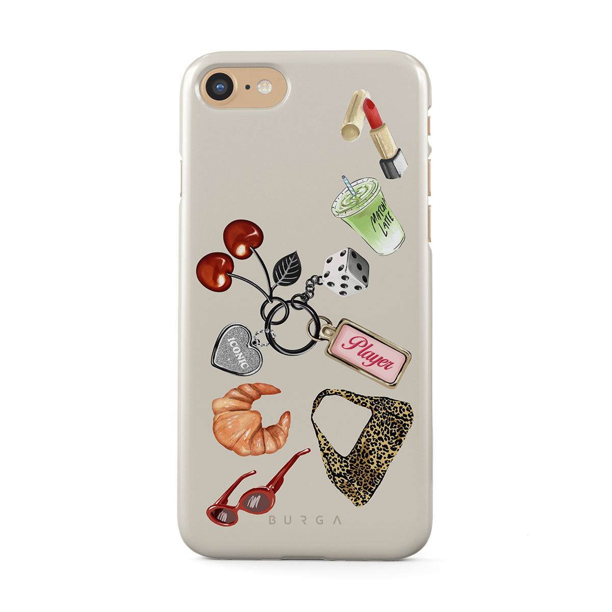 Questo design include: occhiali da sole rossi, rossetto rosso, matcha verde, croissant, dadi neri, borsa maculata leopardata, portachiavi con cuore d’argento, ciliegie, dadi e tag "Player".