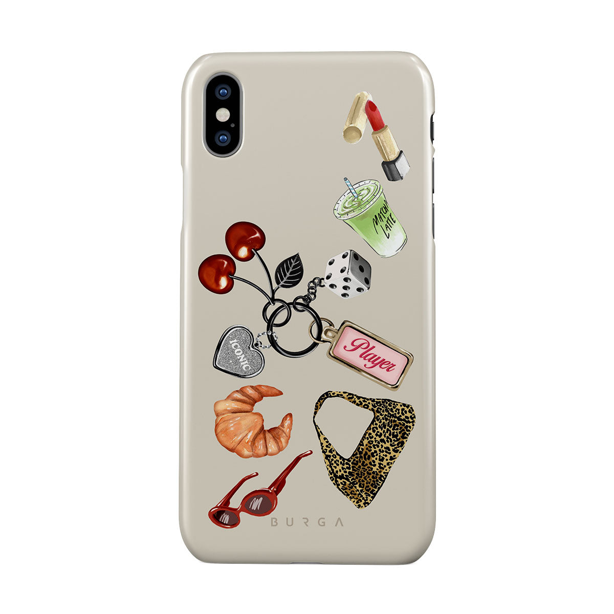 Questo design include: occhiali da sole rossi, rossetto rosso, matcha verde, croissant, dadi neri, borsa maculata leopardata, portachiavi con cuore d’argento, ciliegie, dadi e tag "Player".