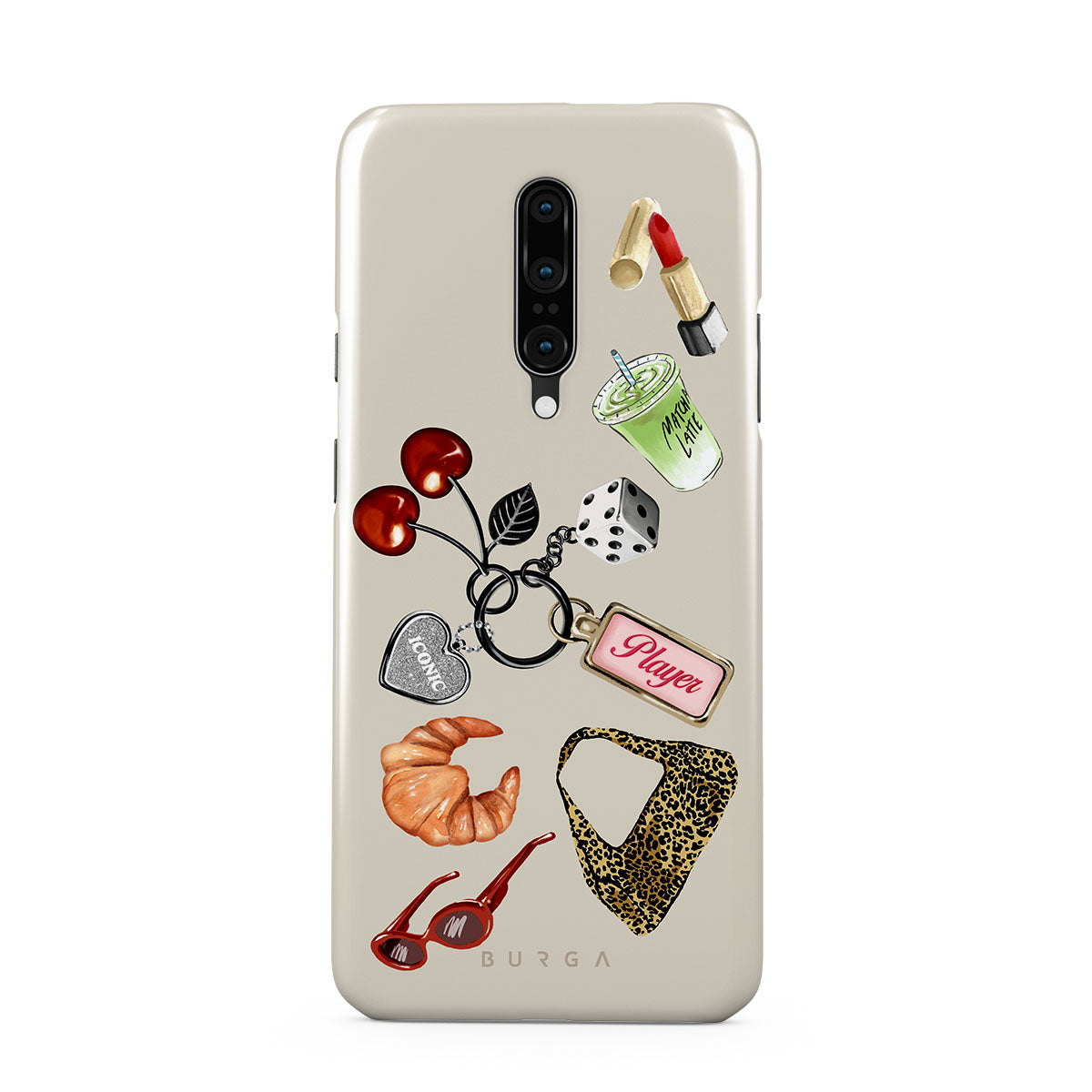 Questo design include: occhiali da sole rossi, rossetto rosso, matcha verde, croissant, dadi neri, borsa maculata leopardata, portachiavi con cuore d’argento, ciliegie, dadi e tag "Player".